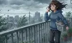 The cherry tree visible from the balcony is swaying vigorously, and while there is some sunlight, the sky is mostly cloudy.